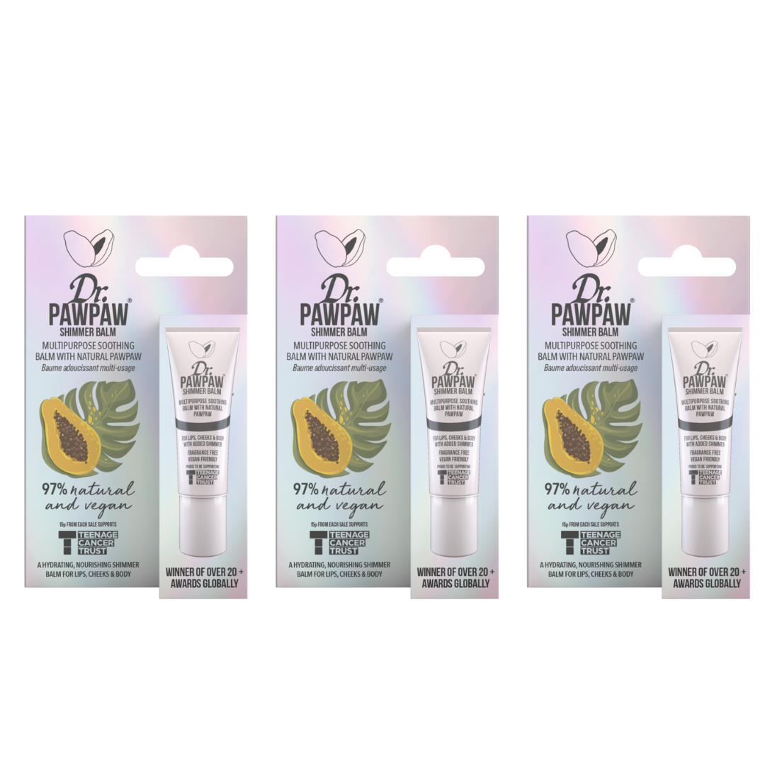 Dr.PAWPAW x Teenage Cancer Trust Shimmer Lip Balm can be used in various ways on the lips, cheekbones, decolletage, and anywhere else you’d like your skin to shimmer and shine. This pearlescent effect is buildable, so you can create a soft, subtle glow or a full-on glam look.